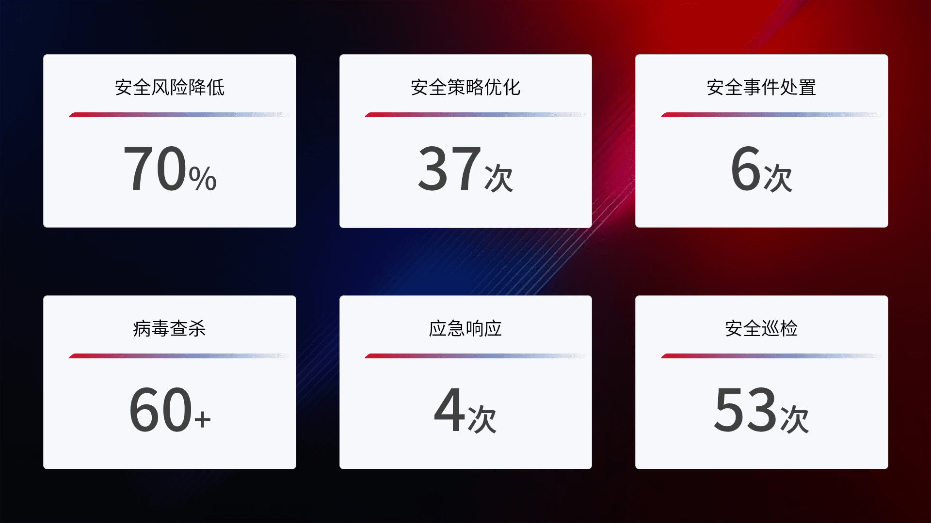 提供全面的安全事件报告体系,,,,包括处置报告、、、、周报、、、、季度和年度总结,,,,结合持续监控,,帮助客户深入了解网络安全状况。。。